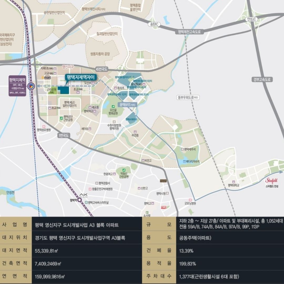 아울러 이미 인근 생활 인프라도 풍부하게 형성되어 있어서, 생활하기에 편리한 환경이 갖추어져 있습니다. 대형 마트인 이마트와 스타필드가 인근에 위치하고 있으며, 뉴코아 아웃렛, AK플라자 등이 있어 언제든지 생활에 필요한 편이시설, 인프라가 충족이 되고, CGV나 레포츠타운, 평택 시청, 법원 등의 문화와 행정에 관련된 인프라들도 편안하게 누릴 수 있는 입지환경을 갖추고 있습니다.