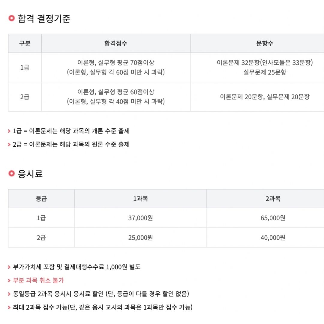1급의 경우 이론형과 실무형에서 평균 득점이 70점 이상이면서 각각 60점 이상이어야 하고, 2급 시험의 경우에는 이론형 문제와 실무형 문제에서 평균 득점이 60점 이상이면서 각각 40점 이상이어야 합격입니다.