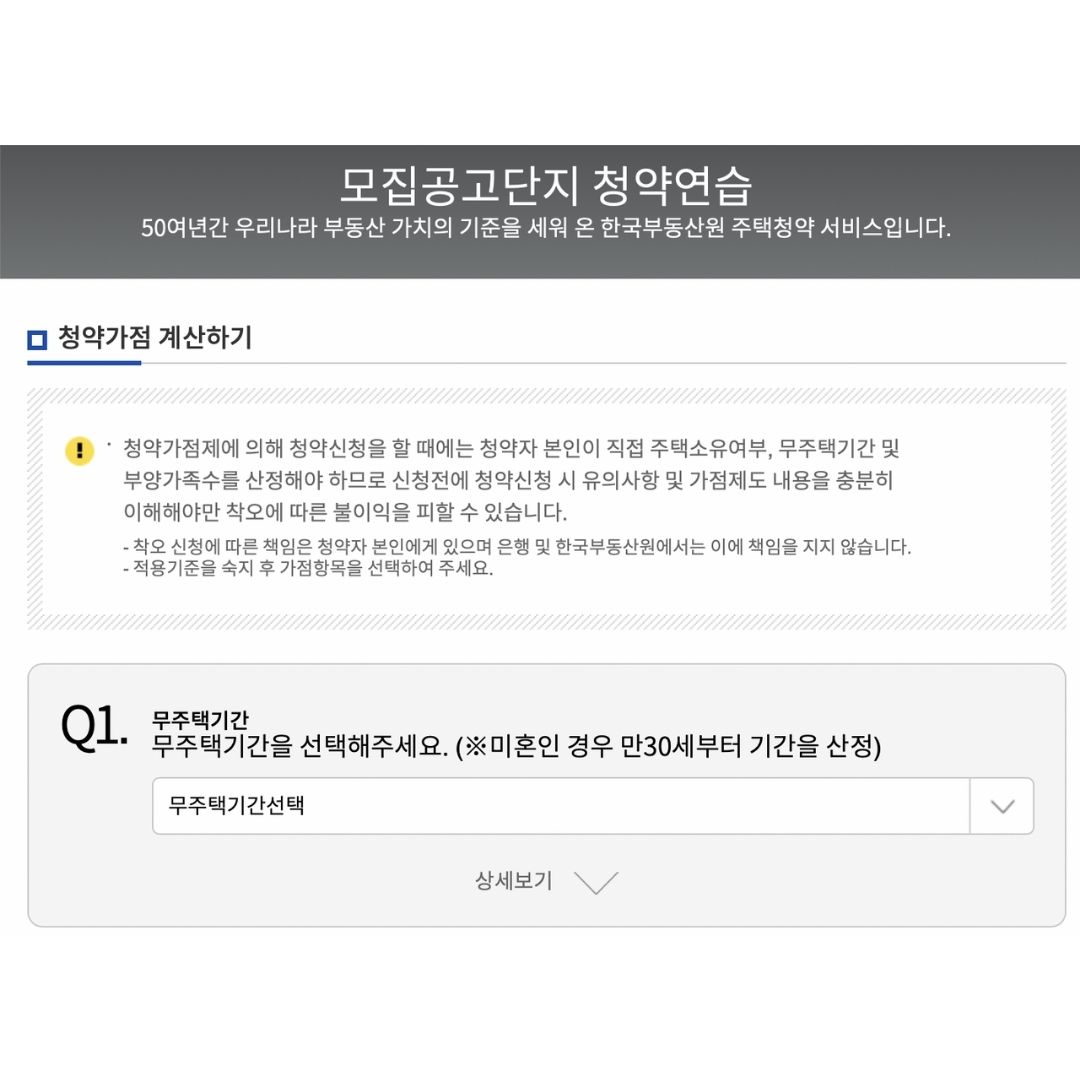 하지만 일일이 계산하기 힘드니 청약홈에서 제공하는 청약가점 계산기를 이용하는 것이 편리하니 한 번 이용해 보시는 것도 좋을 것 같습니다.