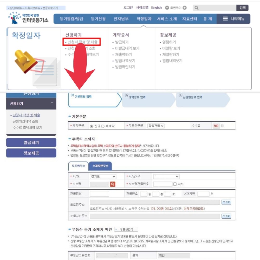 그리고 파란색 메뉴 중에 확정일자라고 보이는 것을 클릭하도록 합니다. 클릭하면 신청하기 바로 아래에 있는 신청서 작성 및 제출 버튼을 누릅니다. 주소를 선택해서 계약서 그대로 입력하여 줍니다. 도로명주소나 지번주소나 결국 같은 물건을 뜻하는 것이지만 계약서에 있는 주소 그대로 입력 해 주어야 합니다.