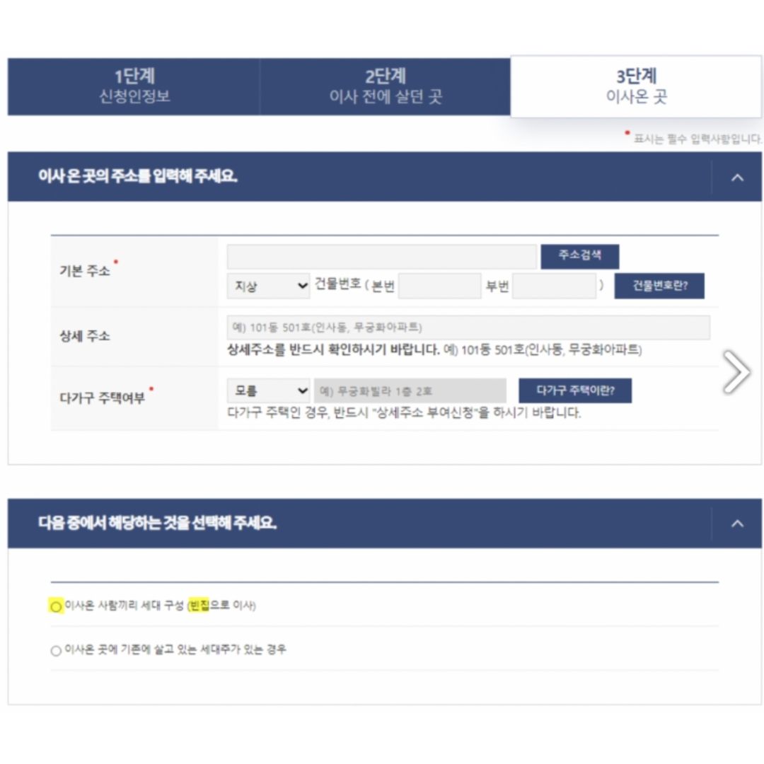 그리고 마지막으로 3단계에서는 이사갈 곳의 정보를 입력합니다. 기본주소와 상세주소, 다가구 주택여부를 입력하고 빈집으로 이사가는지 기존에 살고 있는 세대주가 있는지를 체크하고 민원신청하기를 누르면 입력이 끝나게 됩니다.
