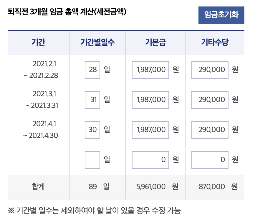 다음은 퇴직전 3개월의 임금 총액 계산을 채워주어야 합니다.